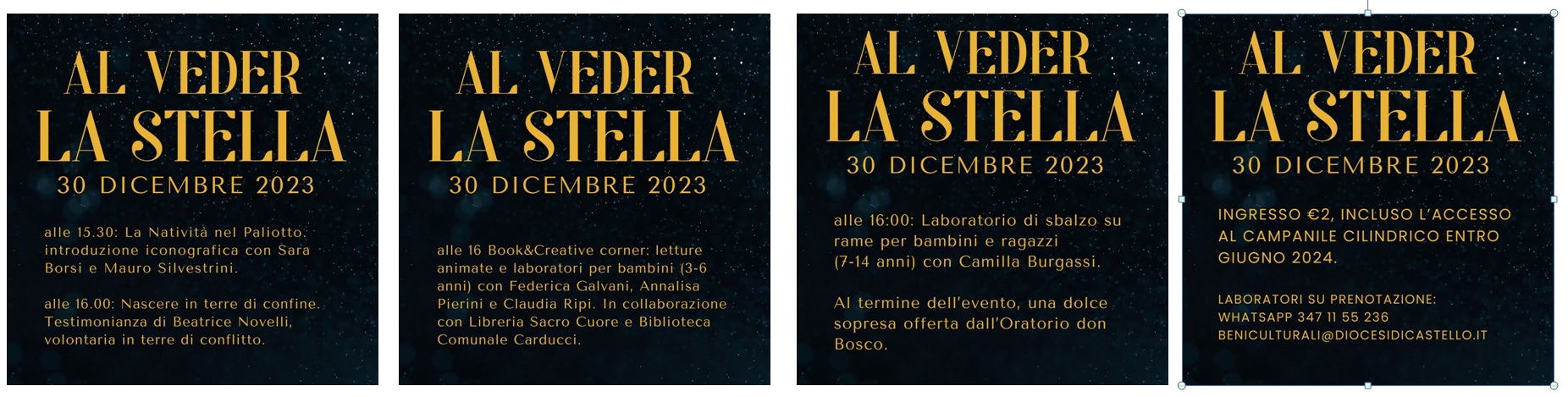 Nonostante il freddo pungente, il pubblico di piazza del Garigliano si è riscaldato alle note del Coro Altotiberino, con le voci da Pieve Santo Stefano e da Caprese Michelangelo dirette da Rita Narducci, e con quelle della Corale Fortebraccio di Montone, guidata da Francesco Fulvi. Tra un brano tradizionale di Natale, uno del pop internazionale, una benedizione musicale irlandese e un canto del Padre nostro in stile africano e testo in zwaili, le voci di Brunella Tacchini e di Irene Bistarelli hanno proposto un itinerario di varie letture.